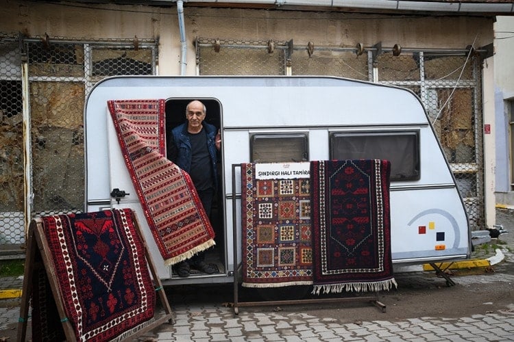Buradaki işyerinde yıpranmış halı ve kilimleri tamir eden Öztürk, Sındırgı’da geçen 10 Ağustos ve 27 Ekim’de meydana gelen 6,1 büyüklüğündeki depremlerin ardından iş yerini karavana taşıdı.