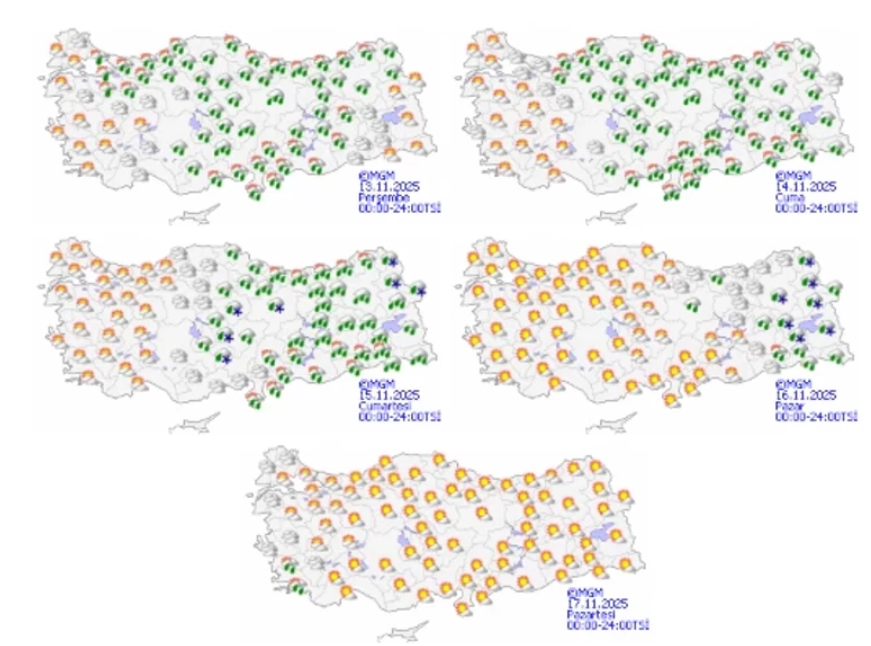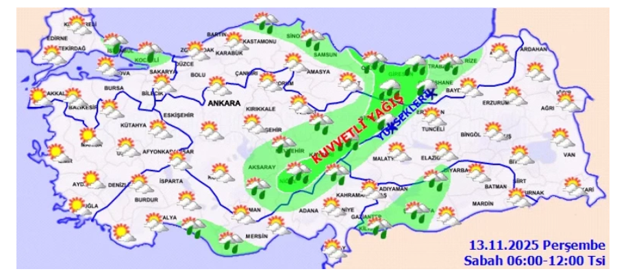 Ülke genelinin parçalı ve çok bulutlu geçeceği, Marmara’nın doğusu, Orta ve Doğu Akdeniz, İç Anadolu’nun güney ve doğusu, Karadeniz, Doğu Anadolu’nun kuzey ve batısı ile Güneydoğu Anadolu’nun batısında yağmur ve sağanak yağışların görüleceği bildirildi.