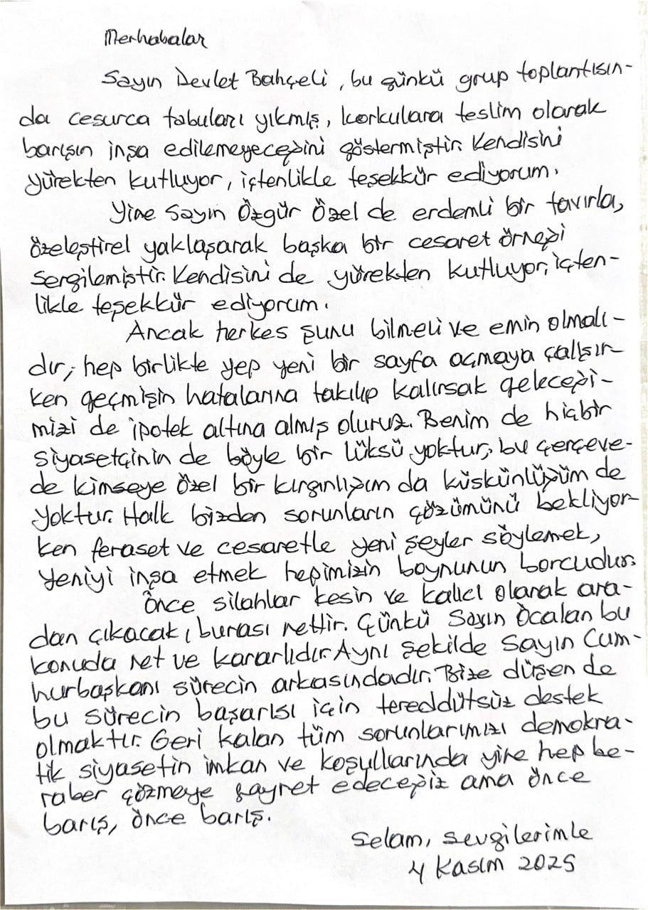Edirne Cezaevi’nde tutuklu bulunan eski HDP Eş Genel Başkanı Selahattin Demirtaş, “Sayın Devlet Bahçeli, bugünkü grup toplantısında cesurca tabuları yıkmış, korkulara teslim olarak barışın inşa edilemeyeceğini göstermiştir. Kendisini yürekten kutluyor, içtenlikle teşekkür ediyorum” dedi.