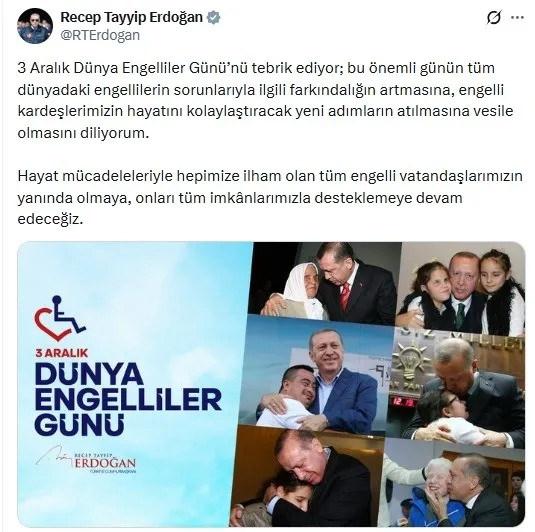 Cumhurbaşkanı Recep Tayyip Erdoğan, 3 Aralık Dünya Engelliler Günü’ne ilişkin sosyal medya hesabından paylaşım yaptı.