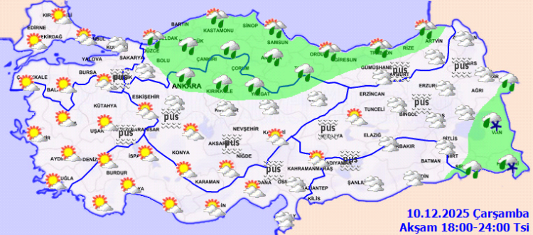 Genellikle yağmur ve sağanak, Doğu Anadolu’nun doğusu ile Sivas çevrelerinde karla karışık yağmur ve kar şeklinde görülmesi beklenen yağışların, Orta ve Doğu Karadeniz kıyılarında yer yer kuvvetli olacağı tahmin ediliyor. Sabah ve gece saatlerinde Marmara’nın doğusu ile iç kesimlerde pus ve yer yer sis, Doğu Anadolu’nun kuzey ve doğusunda buzlanma ve don olayı bekleniyor.