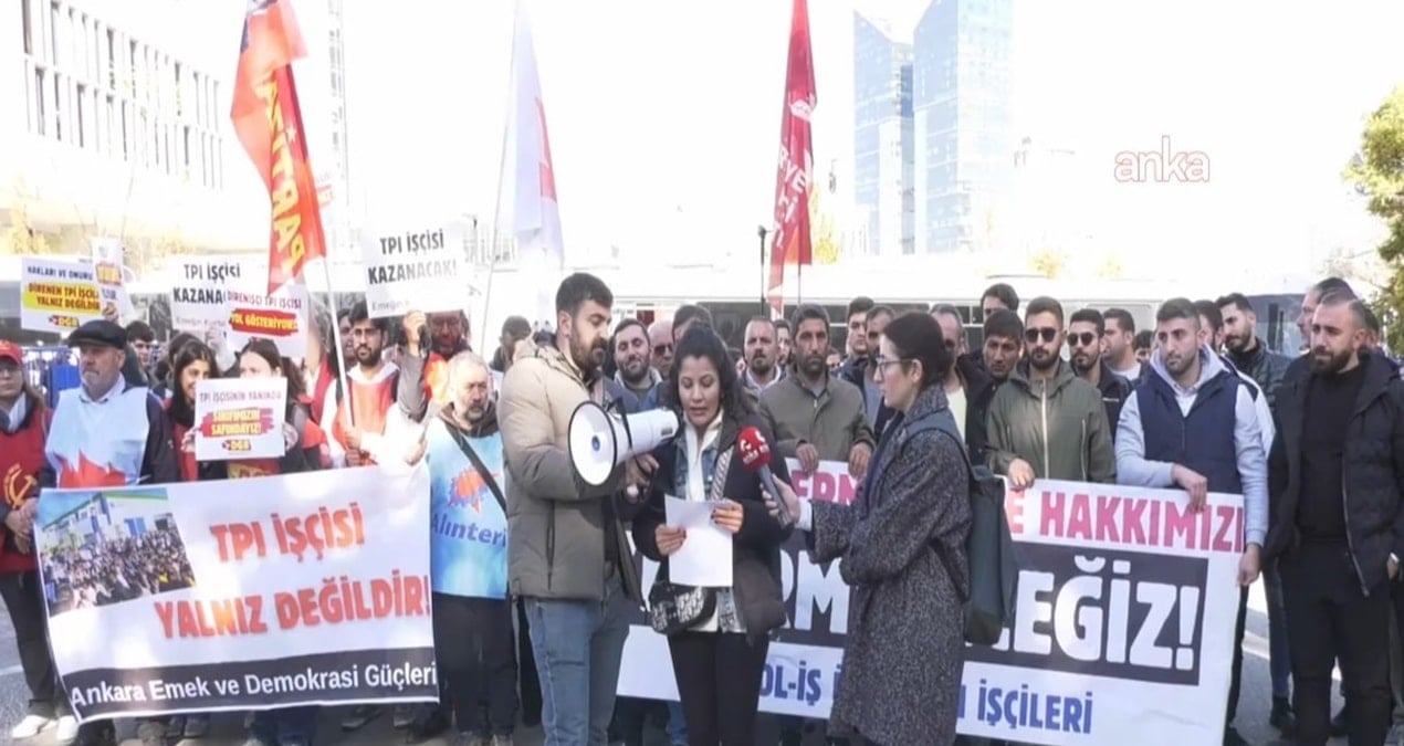ABD merkezli TPI Composites fabrikasında greve çıkan Petrol-İş Sendikası’nın üyesi işçileri hukuka aykırı şekilde işten çıkarılmalarının ardından Söğütözü Metrosu’ndan ABD’nin Ankara Büyükelçiliği’ne yürüdü. İşçiler, “Hakkımız olanı talep etmeye geldik. Bugün buraya yalnız 2 bin 300 TPI işçisini değil tüm Türkiye işçi sınıfının onurunu savunmaya geldik” ifadelerini kullandı.
